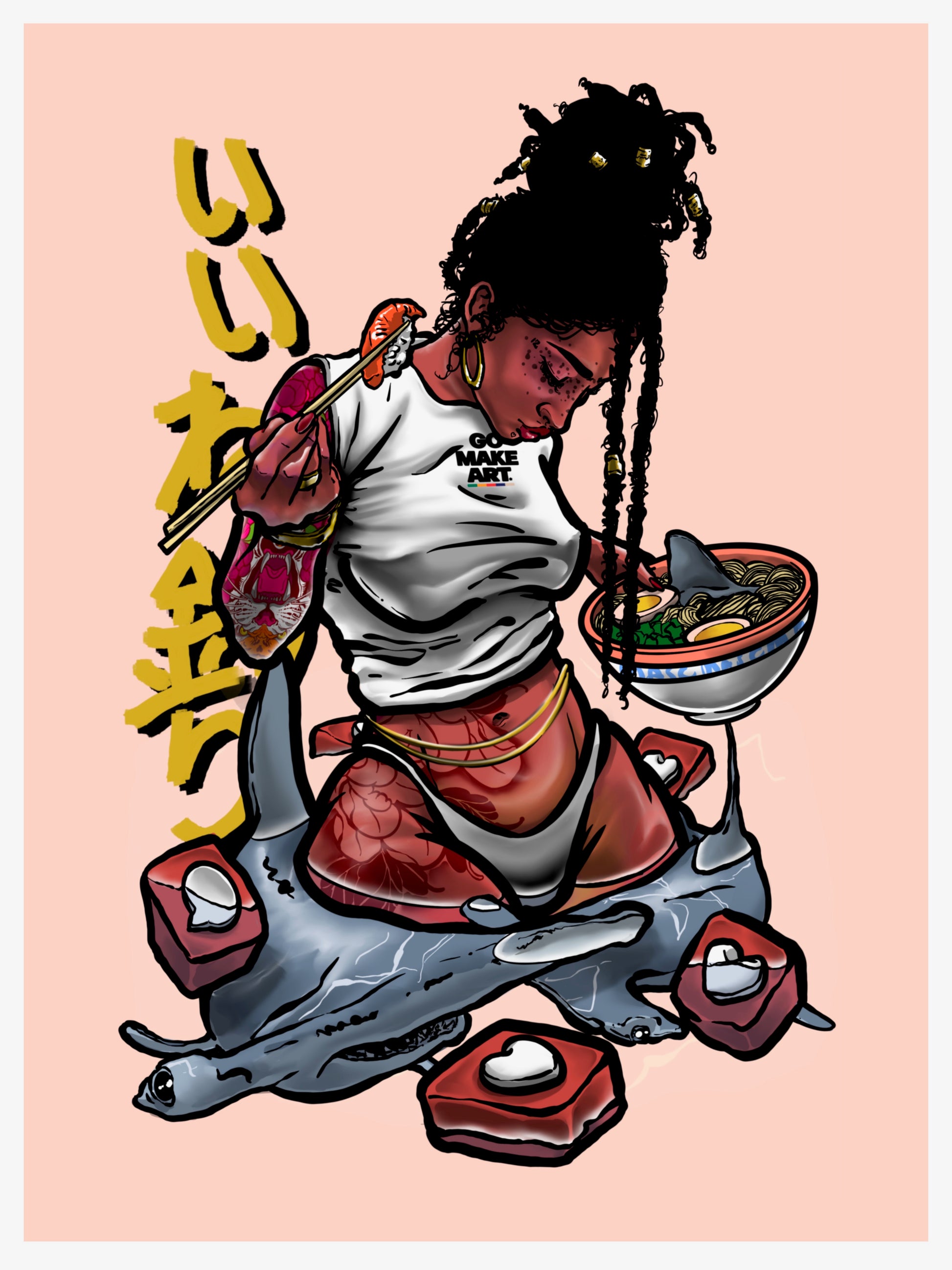 16x12 art print. Thank You for the Food places a lone figure in the water surrounded by circling sharks, her body as offering and defiance at once. The phrase, often spoken before a meal, twists into a statement of survival and a reminder that in a world hungry for beauty and spectacle the line between feast and sacrifice is razor thin. The sharks become symbols of desire, danger, and the endless appetite of the crowd while her stance carries both vulnerability and command.